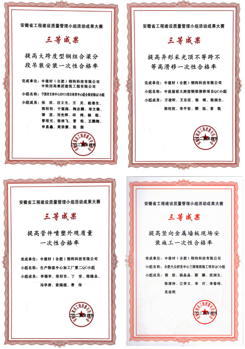 本次在安徽省工程建設QC成果大賽中取得佳績,是對中建材鋼構公司質量管理與創(chuàng)新工作的肯定,也是激勵我們持續(xù)進步的動力。這不僅提升了公司在工程建設領域的品牌影響力,也為參與更高級別市場競爭、承接重大項目增加了重要資質。未來,公司將持續(xù)深化QC小組活動,加大研發(fā)投入,提升智能制造水平,完善質量管理體系,將創(chuàng)新成果轉化為生產力,為客戶提供更優(yōu)質、高效、綠色的鋼結構產品與服務,為工程建設行業(yè)的高質量發(fā)展貢獻力量。